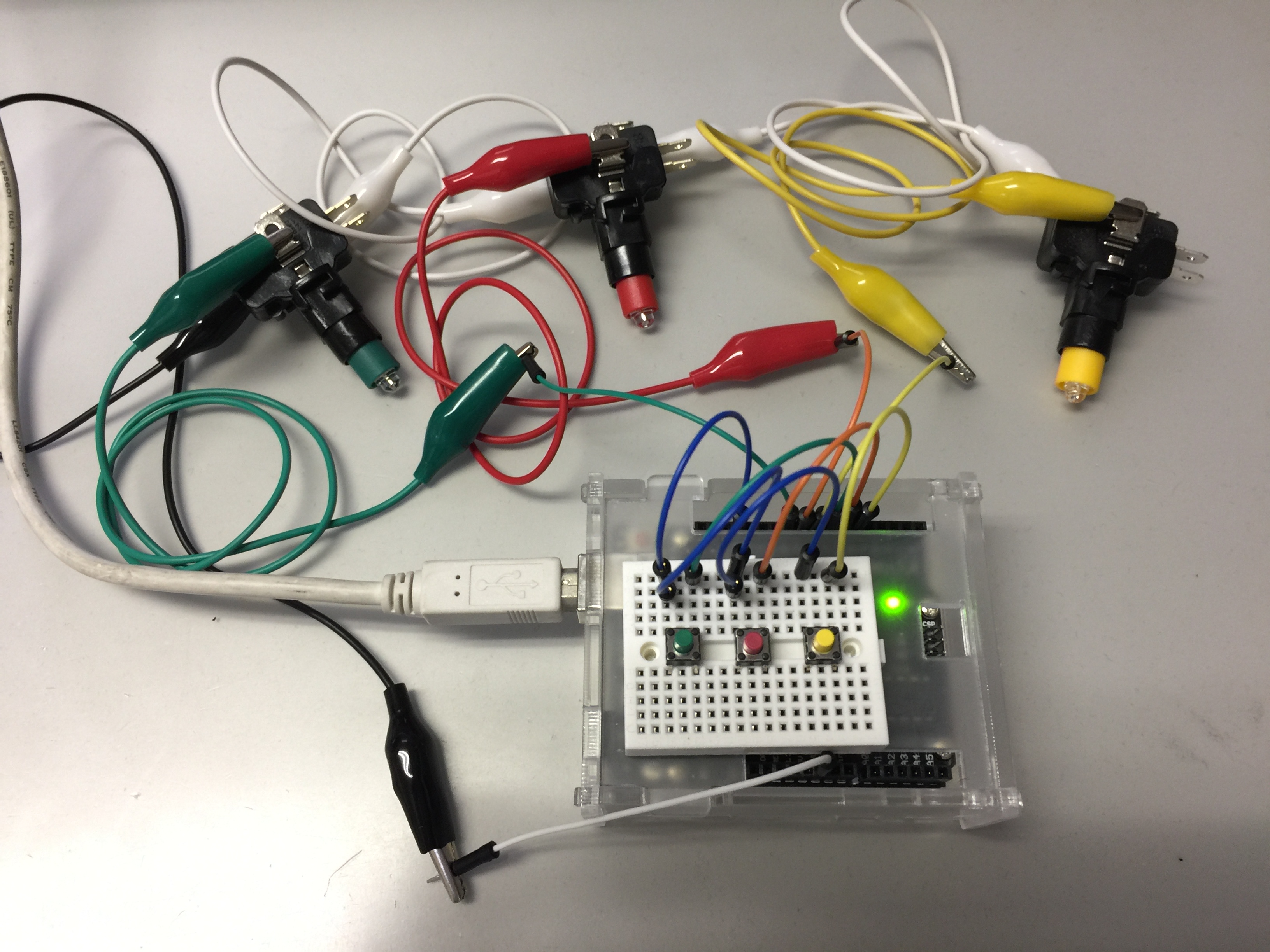 緑色と黄色のプッシュボタンは直径52mmでLEDが入っていましたが、赤色は少し違っていて直径50mmでLED無しでした。 赤色ボタンはLEDがないので、ボタンは光らせない方針とします。LEDが手に入ったら、気が変わって光らせるかもしれませんが。 (2017/08/06追記、LEDを入手しましたので、将来の事例集で光らせたいと思います。別電源にした方がいいのかな。未検討です。 LEDの印加電圧は12Vと書いてあったけど、5Vで光るんだけどなぁ) 材料表にプラボックスを書いていますが、まだプラスチックボックスへのボタンの組み込みはしていません。 ボックスに取り付け穴を開ける道具を持っていないので、近く道具を持っている人のところで加工してきます。 組み込みが終わったら、完成写真を追加したいと思います。時期は未定ですが。 写真でわかるかなぁ、Arduinoのデジタルピンの接続先を一応書いておきます。緑ボタン->7番ピン,赤ボタン->6番ピン,黄ボタン->5番ピンです。 色の順番は適当に決めたので、ご自由に~。 (*)最新のプログラムでは認識するピン番号が変わっていますので、写真の接続は参考にとどめてください。 LEDの点灯テストの様子をとりあえず掲載しておきます。 LED部分には抵抗が入っていましたので、そのままArduinoから出力しています。 緑以外は暗いですね。 プラボックスに組み込んだ完成品です。 LEDはArduinoのDC端子に入力された電圧を使えるようにしています。9V1Aまたは12V2AのDCアダプタを使っています。5Vでは緑がよく光っていましたが、9V/12Vでも傾向は同じです。緑以外の明るさはいまいちです。明るさは緑>赤>黄の順番です。写真は9VのDCアダプタを使った時のものです。 【wcs_button】 Arduinoにつないだ緑色のボタンを押すと、緑ONの状態変化がArduinoからwcs_buttonにシリアル経由で送られます。 ボタンを離すと、緑OFFの状態変化が送られます。赤色ボタンだけを押した時、黄色ボタンだけを押した時、3色すべてのボタンを押した時、のwcs_buttonの画面の様子は以下の通りです。